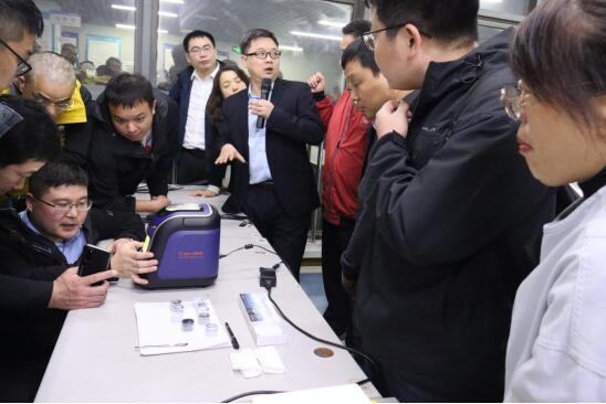 隨后,考察團(tuán)一行移步至公司三樓Cube100S產(chǎn)品生產(chǎn)線。針對(duì)炭黑行業(yè)的關(guān)鍵檢測(cè)需求,天瑞技術(shù)專家在現(xiàn)場(chǎng)對(duì)Cube100S能量色散X熒光光譜儀、EDX3300SPLUS 側(cè)照式單波長(zhǎng)X熒光光譜儀兩款儀器進(jìn)行了專場(chǎng)講解與實(shí)機(jī)演示,儀器表現(xiàn)出的高精度與高穩(wěn)定性,給專家領(lǐng)導(dǎo)們留下了深刻印象。他們不時(shí)駐足,就儀器的檢測(cè)原理、技術(shù)參數(shù)與天瑞工程師進(jìn)行深入交流。