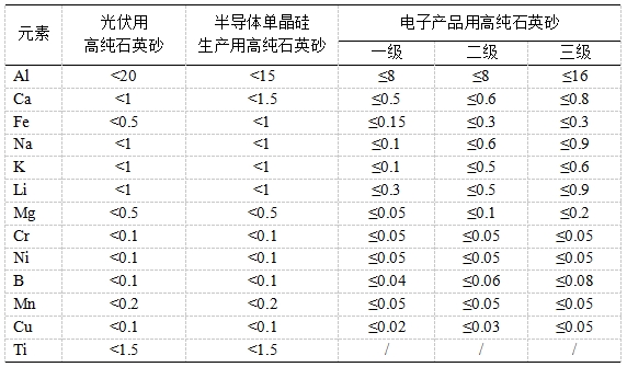 石英砂中雜質(zhì)元素限值(單位:μg/g)