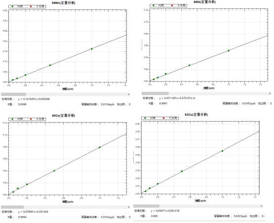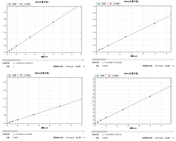 冷焰模式下,繪制各元素0,0.05,0.1,0.2,0.5,1.0μg/L系列濃度標(biāo)液工作曲線(xiàn),39K、40Ca、56Fe等同位素的線(xiàn)性相關(guān)系數(shù)r均大于0.999,背景等效濃度為0.0023μg/L~0.0217μg/L。
