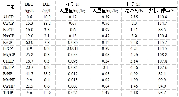 參考《GB/T 32650-2016 電感耦合等離子體質(zhì)譜法檢測(cè)石英砂中痕量元素》進(jìn)行樣品前處理。利用冷焰模式及標(biāo)準(zhǔn)模式對(duì)樣品進(jìn)行測(cè)試,考察背景等效濃度(BEC)、方法檢出限(D.L.)、加標(biāo)回收率、精密度。背景等效濃度在0.6ng/L~60.0ng/L之間,方法檢出限在0.3ng/L~88.2ng/L之間,加標(biāo)回收率在82.1%~120.4%之間,精密度在1.41%~6.92%之間。