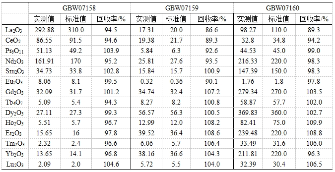 參考《GB/T 40798 離子型稀土原礦化學分析方法 稀土總量的測定 電感耦合等離子體質譜法》,采用氫氟酸、硝酸、高氯酸進行濕法消解。利用碰撞反應模式控制氧化物產率,降低輕稀土氧化物/氫氧化物對其他稀土元素的干擾;并根據實際樣品中元素含量,校準稀土氧化物/氫氧化物的干擾。對三個稀土礦標準物質中14種稀土元素(以氧化物形式表示)進行測試,各元素回收率為86.6 %~109.9%。