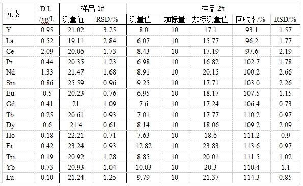 油田稀土示蹤劑主要用來考察油田井間的導通性,具有無放射性、安全穩(wěn)定、用量少、分析精度高等特點。將所得油田水樣搖勻過濾,稀硝酸稀釋一定倍數,以內標法校正樣品基體對待測同位素影響,考察Y、La、Ce等15種稀土示蹤劑的檢出限、精密度(以RSD表示)、加標回收率。發(fā)現檢出限為0.10~2.09ng/L;樣品1#的精密度為0.61%~3.25%;樣品2#中各元素加標回收率為93.1%~114.3%,精密度為0.85%~2.66%。