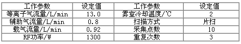以10.0ng/mL Li 、Co 、In 、Ce 、U 和Bi混合調諧液優(yōu)化儀器工作參數,使儀器靈敏度最佳,同時確保氧化物及雙電荷產率低于3%,具體工作參數見表1。在儀器最佳工作參數條件下,以內標法進行測試。