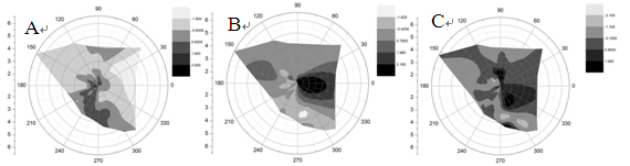 圖6 EHM-X200大氣重金屬監(jiān)測(cè)儀監(jiān)測(cè)數(shù)據(jù)PM2.5中元素主成分分析得到的各組分與風(fēng)向關(guān)系圖。圖A是組分1(工業(yè)、生活燃料燃燒)的濃度與風(fēng)向關(guān)系圖,從圖中可以看出組分1主要來源于監(jiān)測(cè)點(diǎn)位的西南方向(深色區(qū)域);圖B是組分2(冶金工業(yè)廢氣)的濃度與風(fēng)向關(guān)系圖,從圖中可以看出組分2來源于監(jiān)測(cè)點(diǎn)自身范圍內(nèi)(深色區(qū)域);圖C是組分3(揚(yáng)塵)的濃度與風(fēng)向關(guān)系圖,從圖中可以看出組分3主要來源于監(jiān)測(cè)點(diǎn)位的東方及北方(深色區(qū)域)。圖中顏色深淺由淺到深代表污染的程度由小到大。