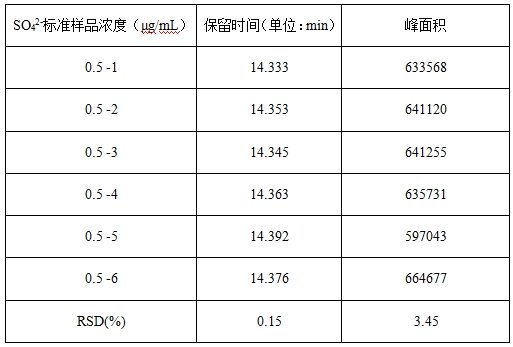 硫酸根離子標(biāo)準(zhǔn)溶液采用梯度濃度的方式逐級稀釋為0.5μg/mL、1.0μg/mL、5.0μg/mL、10.0μg/mL、20.0μg/mL的標(biāo)準(zhǔn)溶液;詳見表1。