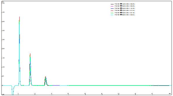 取2.0μg/mL F-、Cl-、Br-混合標準標準溶液重復(fù)進樣6次,考察保留時間和峰面積的重復(fù)性,詳見圖4;其中保留時間(tR)相對偏差在0.10%-0.16%之間,峰面積(S)的相對標準偏差在0.38%~0.53%之間,重復(fù)性結(jié)果詳見表1。