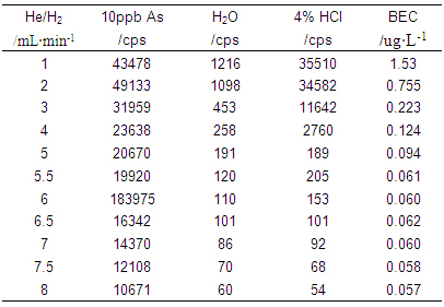 儀器首先在標(biāo)準(zhǔn)模式下進(jìn)行參數(shù)優(yōu)化(利用10μg·L-1的Li、Co、In、U、Ce調(diào)諧液對儀器工作參數(shù)進(jìn)行調(diào)節(jié),使儀器靈敏度高,同時氧化物及雙電荷產(chǎn)率小于3%);再開啟He/H2碰撞反應(yīng)氣,逐步增大He/H2流量,測試超純水、4%HCl及10μg·L-1 As(4%HCl介質(zhì))在75amu處的響應(yīng)信號,計算其背景等效濃度(詳細(xì)數(shù)據(jù)見表1及圖1);并利用As標(biāo)液進(jìn)一步優(yōu)化He/H2流量,得到儀器工作參數(shù)如表2所示。