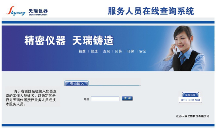 經(jīng)過2個月的準(zhǔn)備工作,天瑞儀器“服務(wù)人員在線查詢”系統(tǒng)今日投入試運(yùn)行,該系統(tǒng)涵蓋了天瑞儀器在職的銷售和技術(shù)服務(wù)人員的基本信息,通過該查詢系統(tǒng),客戶可以隨時查詢上門服務(wù)的銷售或者技術(shù)服務(wù)人員相關(guān)信息。